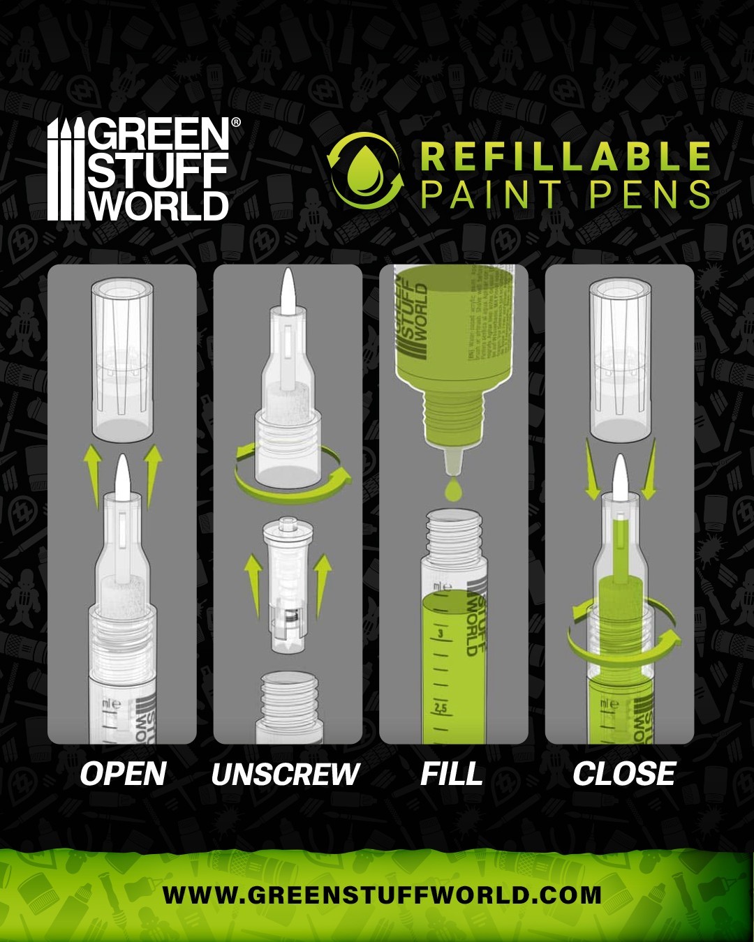 Designed as a tool for all types of painters, our markers have been created to facilitate the process of painting miniatures, models, scenery, maquettes, figures, etc. Easy to load and use, they can be refilled with a wide variety of inks and paints, both acrylic and metallic, making them an essential item in your studio. Manufactured with different types of tips, so that they can be adapted to every need during painting sessions.